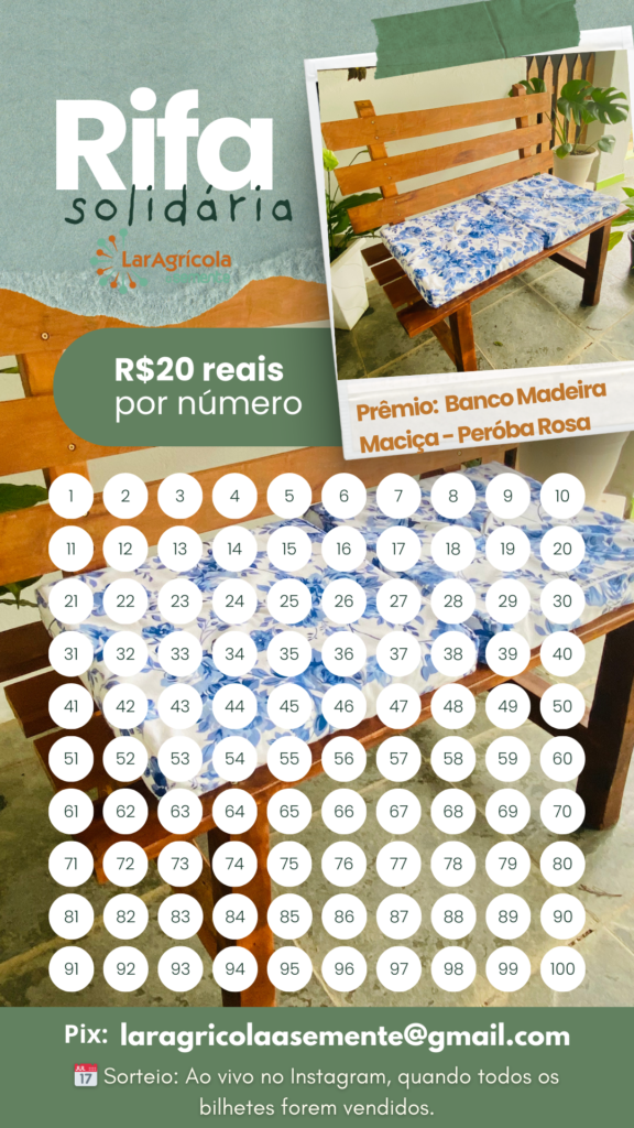 Participe da nossa rifa solidária e ajude o Lar Agrícola a conquistar um Novo Carro! 🧡 Você ainda concorre a um banco artesanal feito em madeira maciça!